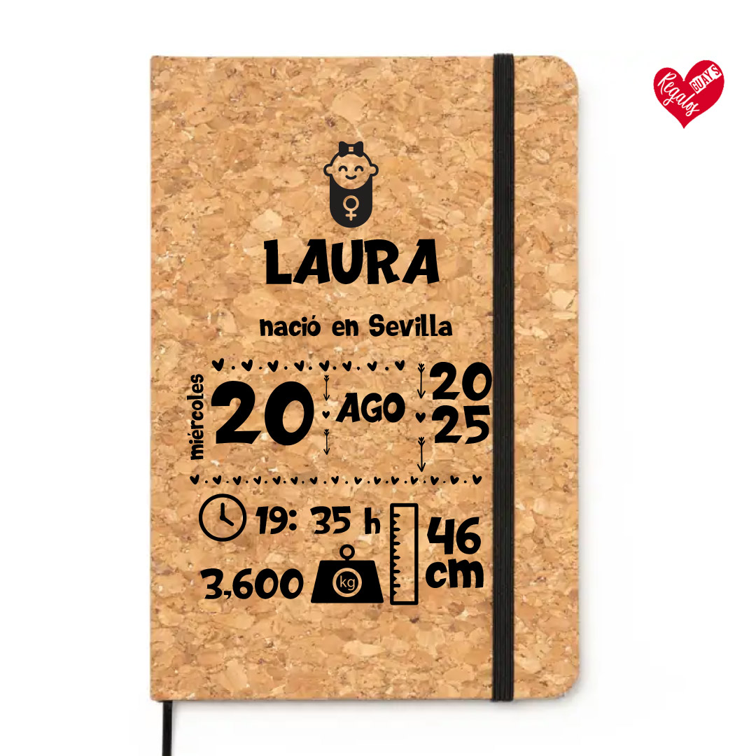 Este bloc de corcho personalizado recoge en un diseño dulce y elegante todos los datos del nacimiento del bebé: su nombre, dónde nació, el día, la hora, el peso y la altura.