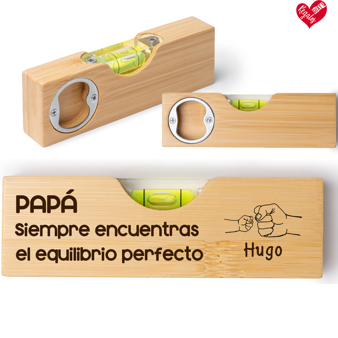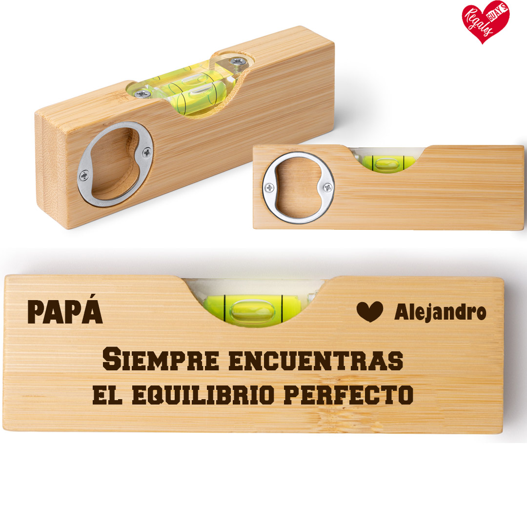 Nuestro nivel de burbuja personalizado con abridor de botellas es mucho más que una herramienta: es un detalle práctico con un mensaje que emociona.