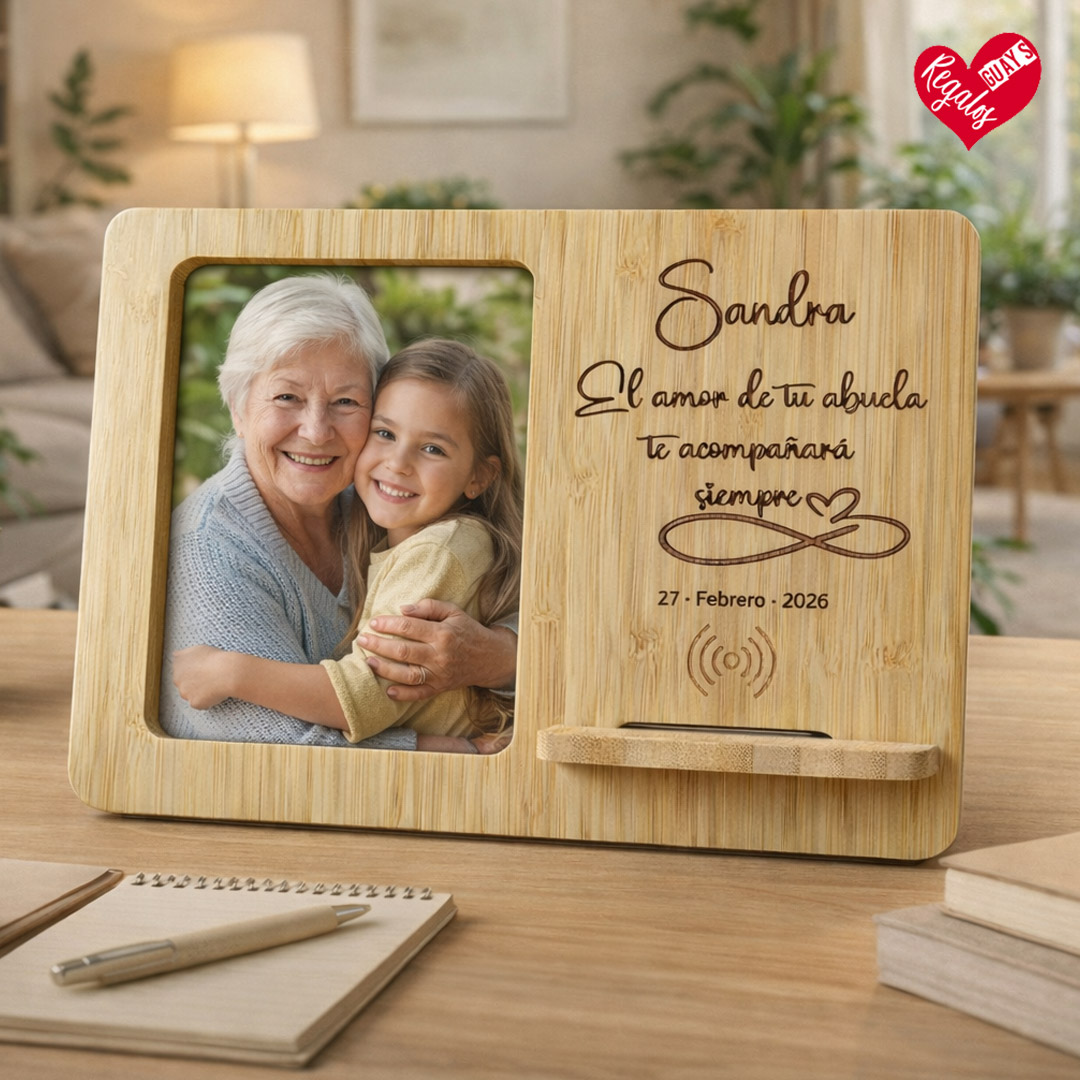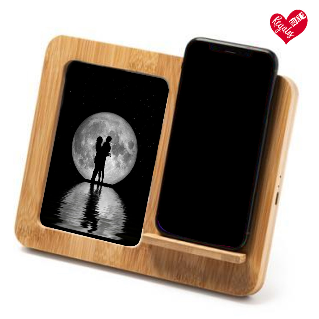Este marco de bambú natural combina un recuerdo visible cada día con la utilidad de la carga inalámbrica: mientras cargas el móvil, tienes siempre presente a quien quieres.